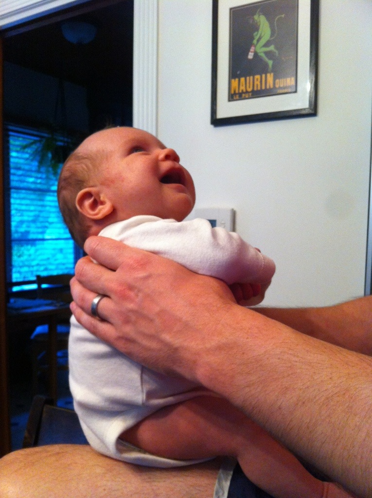 We have found that if we can keep her up a decent amount during the day, she does pretty well at night, going down somewhere between 8-10pm and waking up between 6-7am with 2-3 feedings in between. She tends to start to “squawk” and make sucking noises in REM sleep to let Mommy know she’s getting hungry – saving her loud shrieks for when she’s getting her diaper changed in the nursery, dampening the noise for sleepy Daddy. She also “squawks” as she self-soothes back to sleep after feedings, but it usually only lasts a few minutes. However, on days like Wed where she slept from 9am almost straight to 2pm in her car seat while running errands with Mommy, then the eyes pop open and alert after the 3am feeding and no one is very rested the next day. We won’t be letting that happen again!