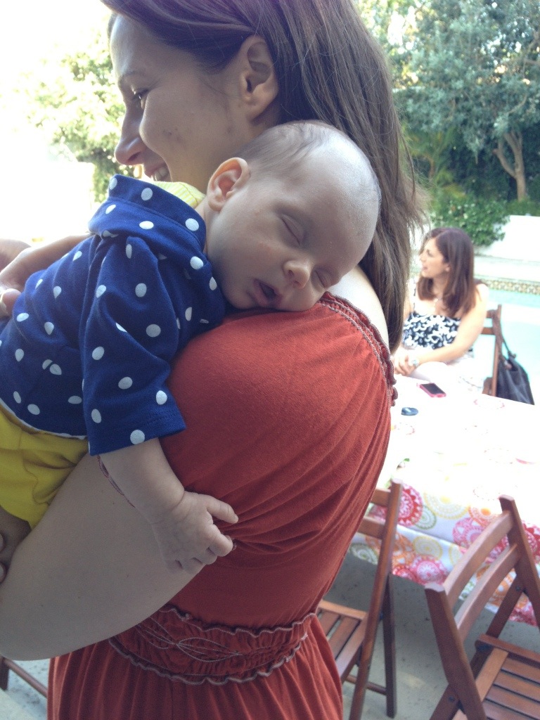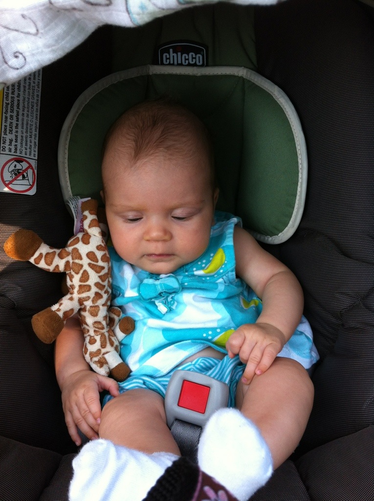 At 4.5 weeks I started a Mommy & Me class where Sonia and I get to interact with other mommies with babies of the same age, talk about developmental topics with the psychologist group leader, and learn some fun songs and activities to do together. I’ve been to two sessions already, and learned a lot each time, including that Sonia seems to be a relatively good baby (so far). One thing I do now know is that her sleeping through many outings (like Adriana’s baby shower) and with guests is a common defense mechanism at this age, and it will go away. Unfortunately, that means that many people still haven’t gotten to see her pretty eyes in person 🙂