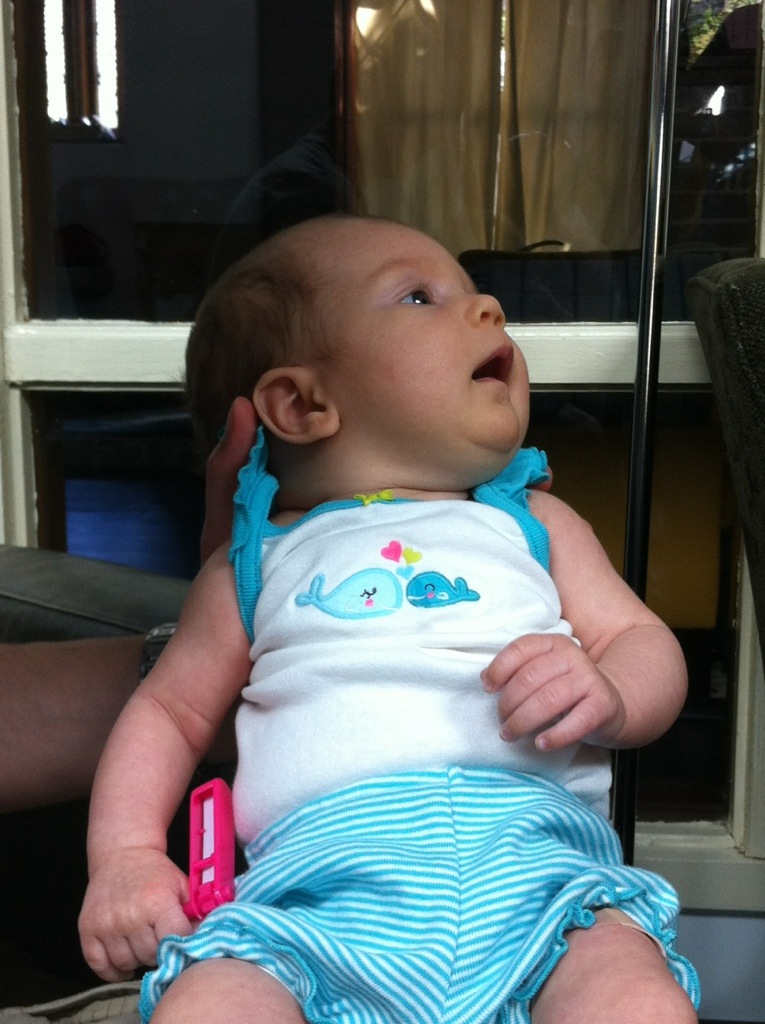 Along with the physical growth, this week has seemed to be an in-limbo week in some developmental growth as well. She seemed to be more interested in getting her hands to her mouth, and has been finding her thumb with a bit more regularity.