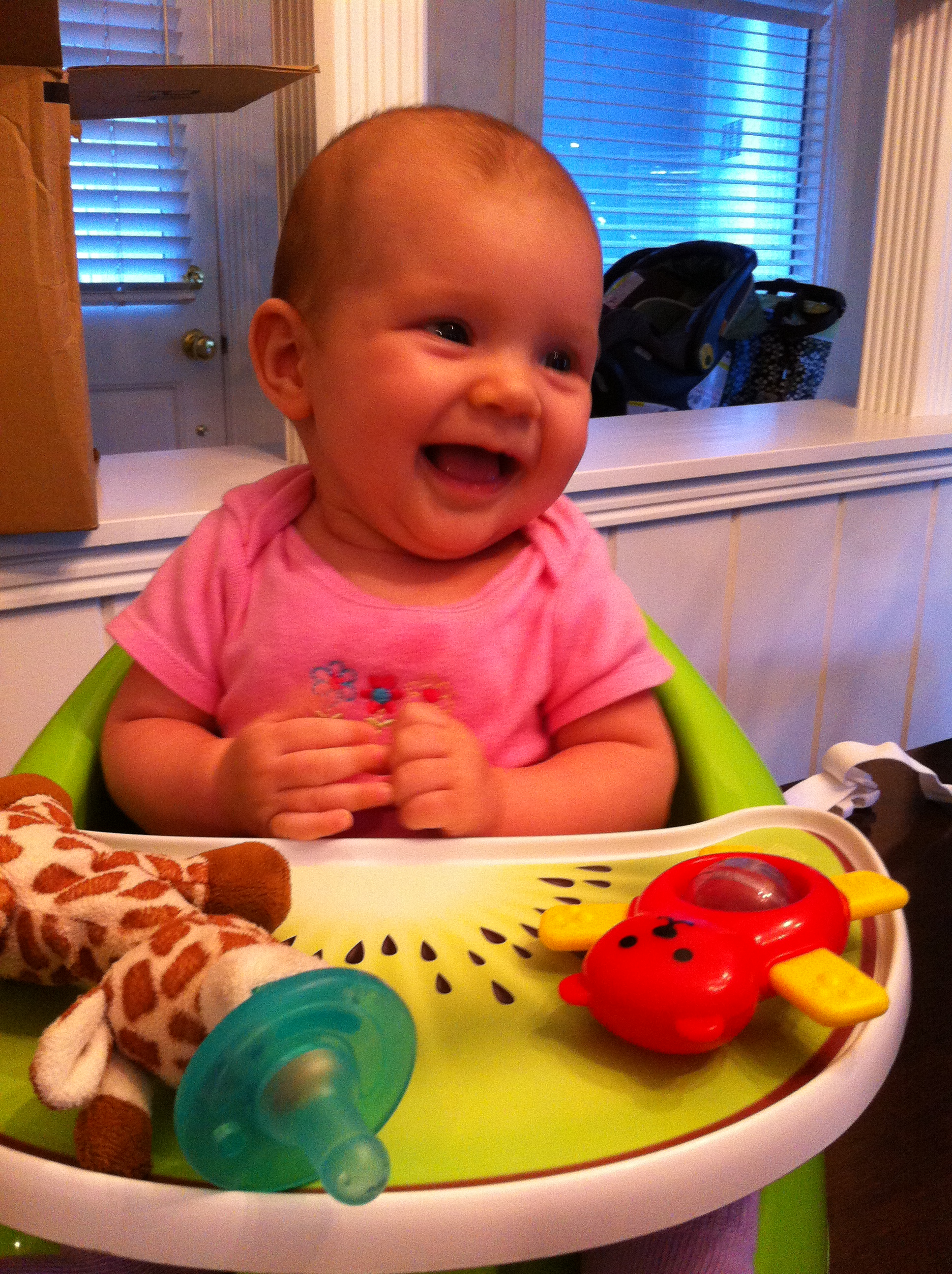Dalton mostly kept a schedule of one night feeding around 4am and 3 daily naps throughout the month, but did have a few nights of “regression” in the form of the dreaded smiling, laughing baby in the middle of the night. Thankfully, not usually too many in a row. Up until now, he has been swaddled for naps and night sleeps. However, at his 4am feeding on his 5 mo birthday, he had flipped himself face down by the time I got up to get him for the feeding, so no more swaddle from here. Eek!