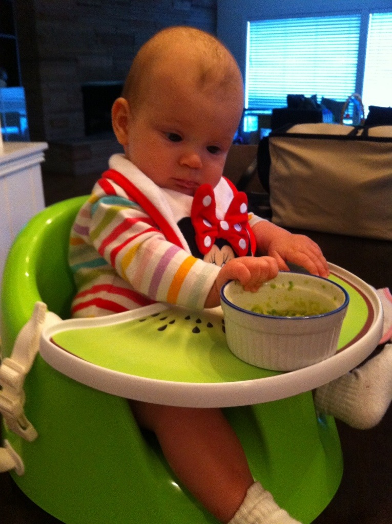 A couple weeks later, Dalton is now eating 3 solid meals a day (from a spoon), and has started to have the “veggie wedgie” poop indicating he’s getting some nutrition out of it. However, his milk intake hasn’t declined much at all. My milk stash was drawn down pretty quickly this month. Luckily, a friend who had a baby a month before me happened to have an oversupply that she was willing to share, so I haven’t had to introduce formula yet.