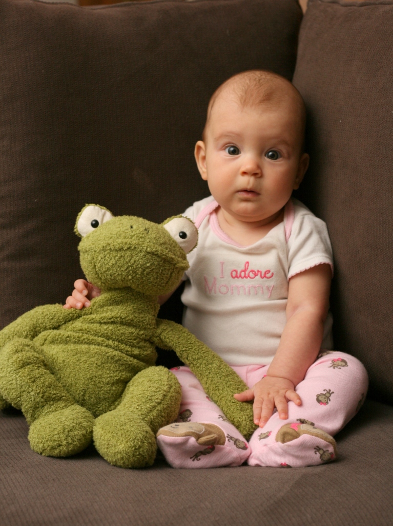 Body Control: Sonia really has made a lot of progress in getting control over her arms and legs. She now bats at toys with regularity, and has started to grasp objects. Every once in awhile she will even bring them to her mouth. Soon, I’m sure, I’ll be wishing she wouldn’t 🙂 She also really enjoys kicking now, and we recently brought out her Kick-and-Play piano gym for some self-discovery time. Also, even though she hasn’t been able to tolerate much tummy time, she can lift her head and some of her chest off the table when her arms are positioned right, and she has stabilized a lot when we hold her upright to play and look around – which she loves! She even feels like she can stand sometimes! She’s still a bit of a bobble head, with not much fine movement, but the progress is pretty impressive.