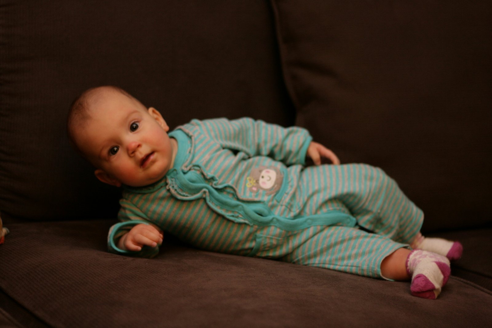 Cooing: Sonia has really amped up the pre-language baby noises in the past week or so, and I *swear* I can hear real words in there! One of her common ones sounds a whole lot like “green,” and the first time she did it was right after I showed her a green diaper I was going to put on her. She also has one that sounds a bit like “Daddy” and is getting a strong “Hi” as well, which is a word we both say to her often (and a pretty easy one for a baby to emulate).