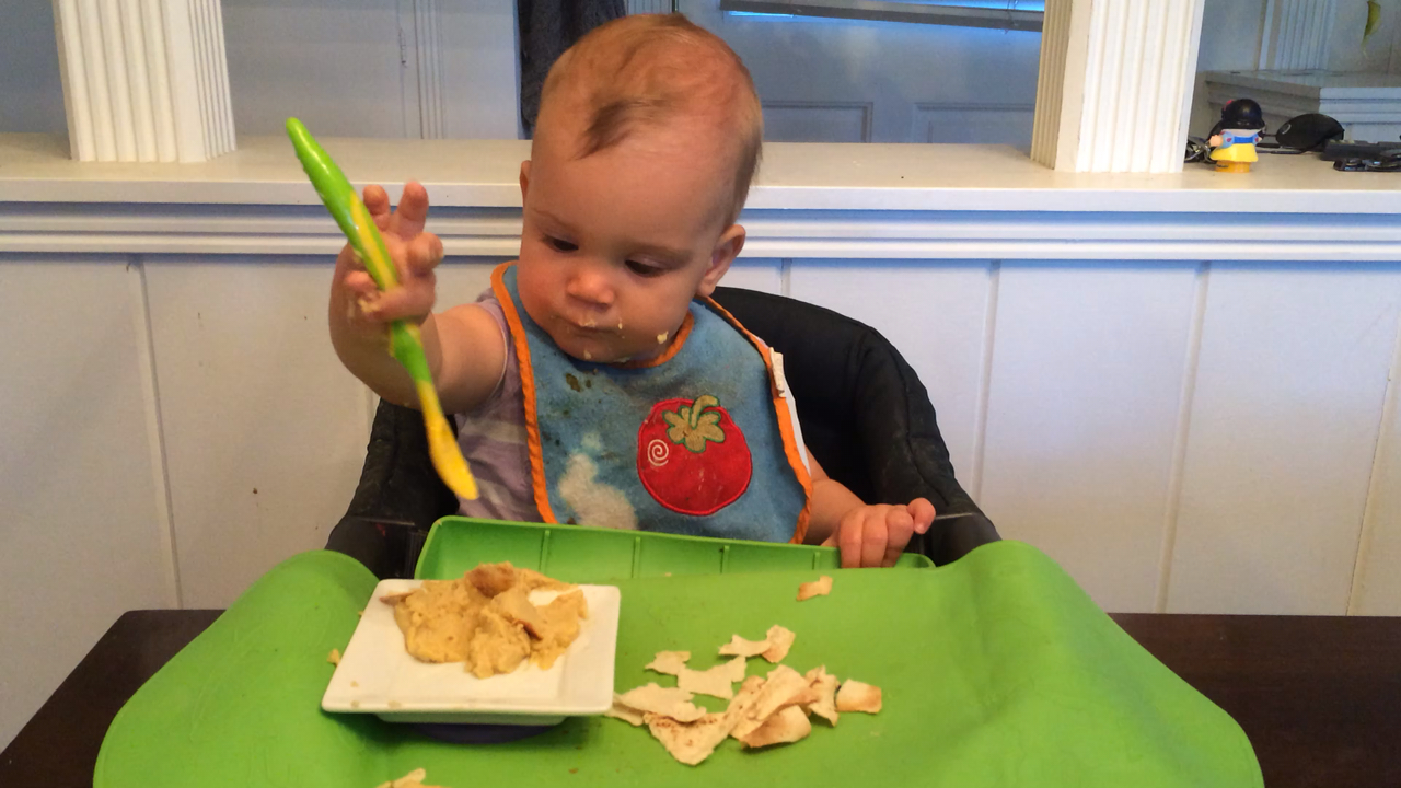 We are still waiting for Dalton to show any interest at all in feeding himself. We often put food in front of him, and are amazed at how much he will play with food, without EVER taking it to his mouth, whereas every other toy goes straight there. I’m sure he’ll get it at some point, but in the meantime, he still eats whatever we eat, just after being blended and served on a spoon.