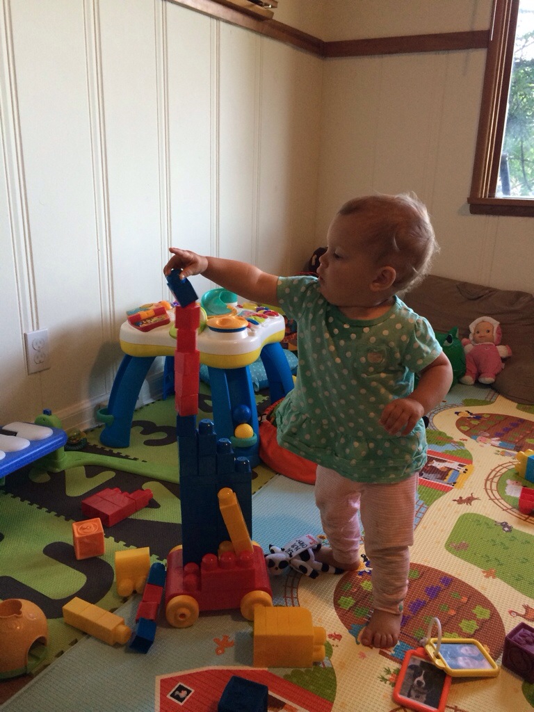Sonia’s spatial reasoning has improved dramatically this month as well, and I do wonder if watching the other kids at school has impacted that. She is now able to unzip her mega bloks bag, and wants to build with the same color and in symmetrical patterns. One of her favorite toys this month has been the animal puzzle blocks she has had since her first birthday. She started with wanting Mommy to “make chicken”, to then being able to pick out all the chicken pieces but put them in the wrong place, to finally, at the end of the month, being able to put all of the pieces together correctly and know which animal would be on the other side when she flipped the puzzle over onto the table. In addition, her coloring has turned into lots and lots of circles and spirals instead of the linear scribbling.