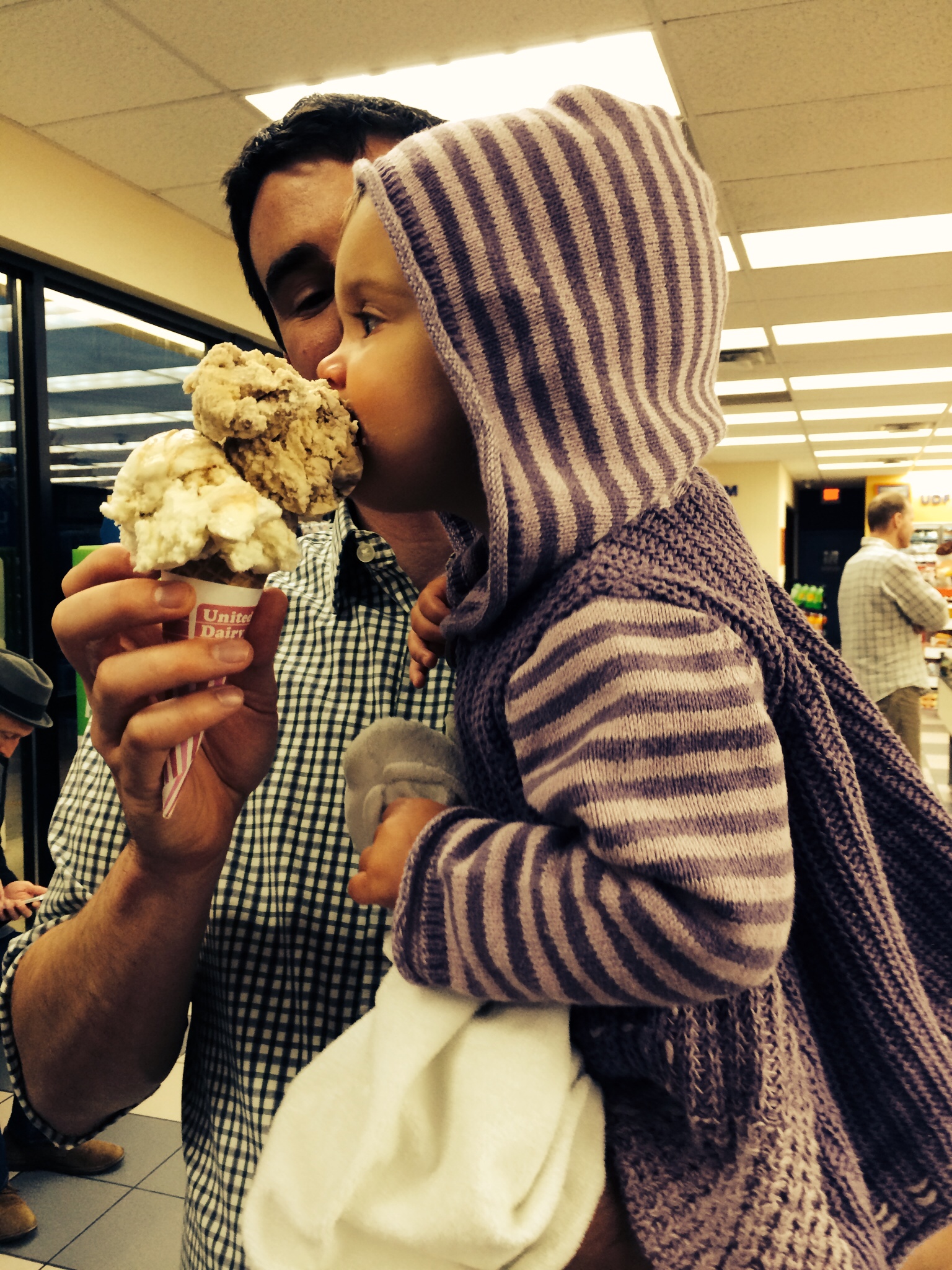 The big step that occurred mid-way through the quarter was potty training. We’d been talking about the toilet, and she’d even been using it once in awhile for almost 6 months. By around 26 months, though, she was often running to the potty herself when she had to pee. After coming home from school with an awful rash one Friday, we decided it was time to ditch the diapers. We went and bought her some undies Saturday morning, and amazingly she had zero accidents all weekend long! When she went back to school on Monday, she had three accidents in the span of 2 hours, so the teacher put her back in diapers and then sent her home with a note about their policy of no diapers once potty training had started – annoying. After a talk with her that evening about having to go up to the teacher and tell them when she had to go so they could help her to the toilet, she went accident free the rest of the week, and really has had only a handful of accidents since! She even figured out on her own she wasn’t supposed to pee during sleep either, even though we had decided we weren’t going to push that part yet since she was still in a crib. Within a week, though, she was waking up dry from naps, and crying for us in the middle of the night to help her to the toilet, so we followed her lead and started putting her in undies, and she has not had a single night-time accident! About a month into it, she’s even starting to be able to pull her own pants down and hold it all night without having to wake us up, yippee! What was even better about the whole thing was that there were no rewards or punishments necessary other than teaching her that it was good and she should feel proud of herself for going on the big toilet. We are so proud of our little ‘big girl!’