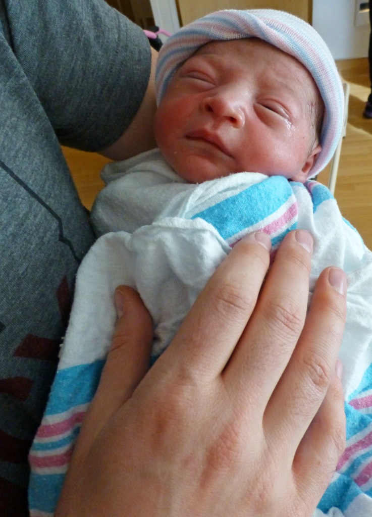 My water broke on my due date – perhaps in part due to the 5 miles I walked that day and all the supposed labor-inducing activities and foods we’d been trying since the previous weekend – but my body still wasn’t fully ready for labor I guess. Sonia was born 27.5 hrs later on April 18 at 6:59pm. However, that time consisted of: 12 hrs of waiting futilely for my body to start labor on it’s own, 13 hrs of active labor with a very high dose of Pitocin (and luckily a great coach in Daddy Eric), 2 hours of labor and transition in bed with an epidural, and a little over 30 mins of mostly numb pushing in a recumbent position as the epidural wore off slowly.