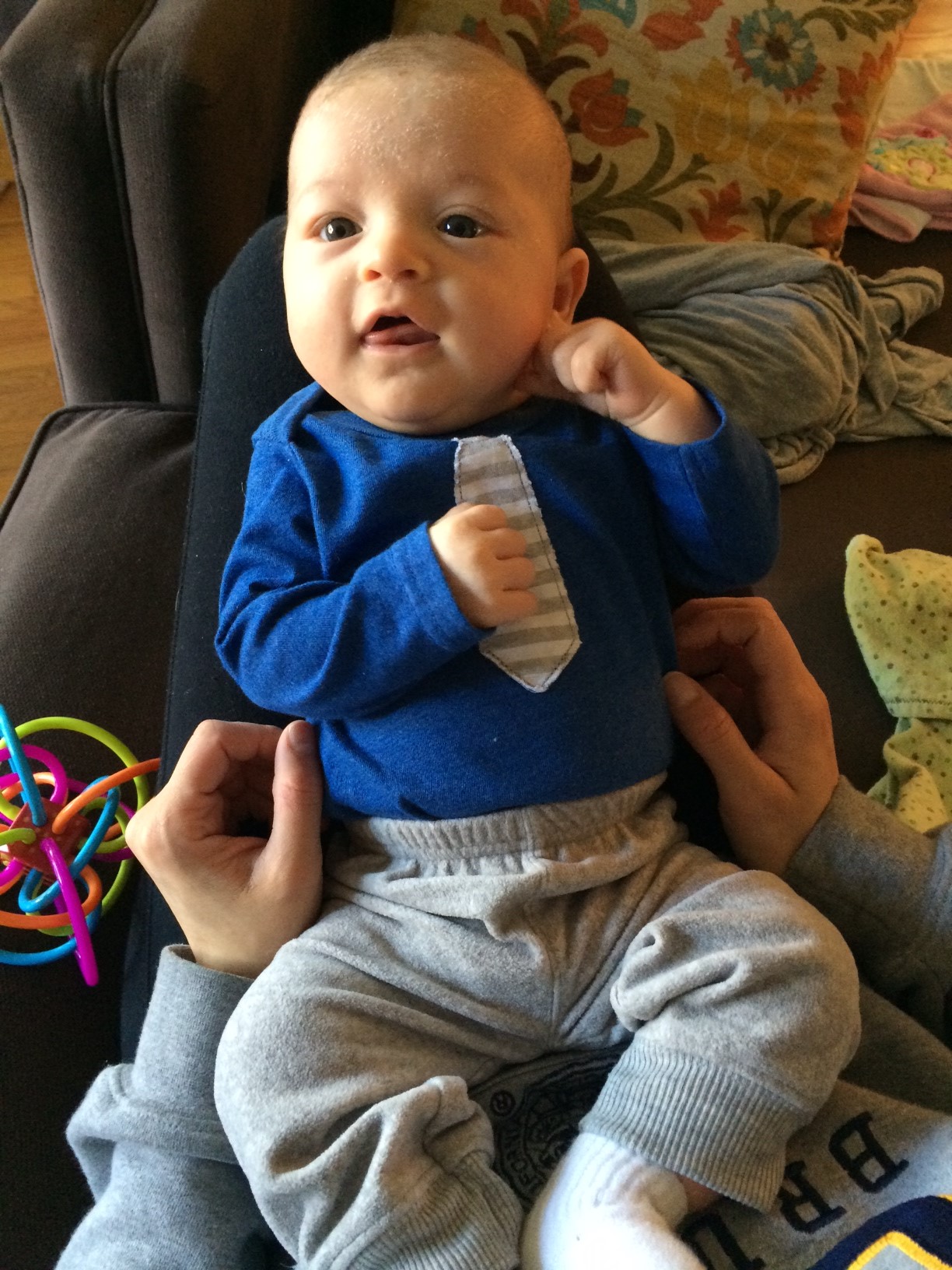 Mid-way through Dalton’s 10th week, he stopped the crying after feeding just as suddenly as he had started it 2 weeks earlier, leaving me to assume it was mainly developmental. In his 11th week, Dalton definitely seemed to make another leap, focusing a lot more on grasping toys and getting his hands to his mouth, as well as finally making eye contact with regularity. He even seemed to enjoy his first game of peek-a-boo 🙂 In his 12th and 13th weeks, Dalton started to do little crunches, and push off of us with his feet as if to stand. He also found his voice, and greatly improved his head and neck strength. Dalton is ready to be up and exploring, and now really likes to ride in the stroller while he is awake. His favorite toys include his Winkel ball, and the blankets we put on him and over him while out for a walk, in addition to Bugaboo of course. 🙂