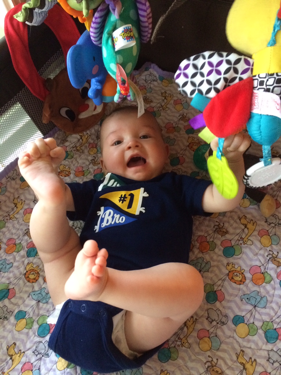 In the last week or so, Dalton has finally achieved a couple key developmental milestones. In the same weekend he decided he wanted to roll over both ways and also sit up unassisted. He also continues to occasionally skip his third nap of the day, and definitely prefers to sleep on his belly for longer naps, but isn’t fully ready to move to two naps. He does frequently wake up very early in the morning and “sings” and “squawks” until he falls back to sleep.