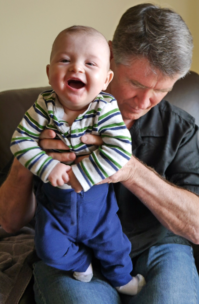 At 4 months, Dalton is 14 lbs (20%) and 26″ (80%), and it has been another happy month.