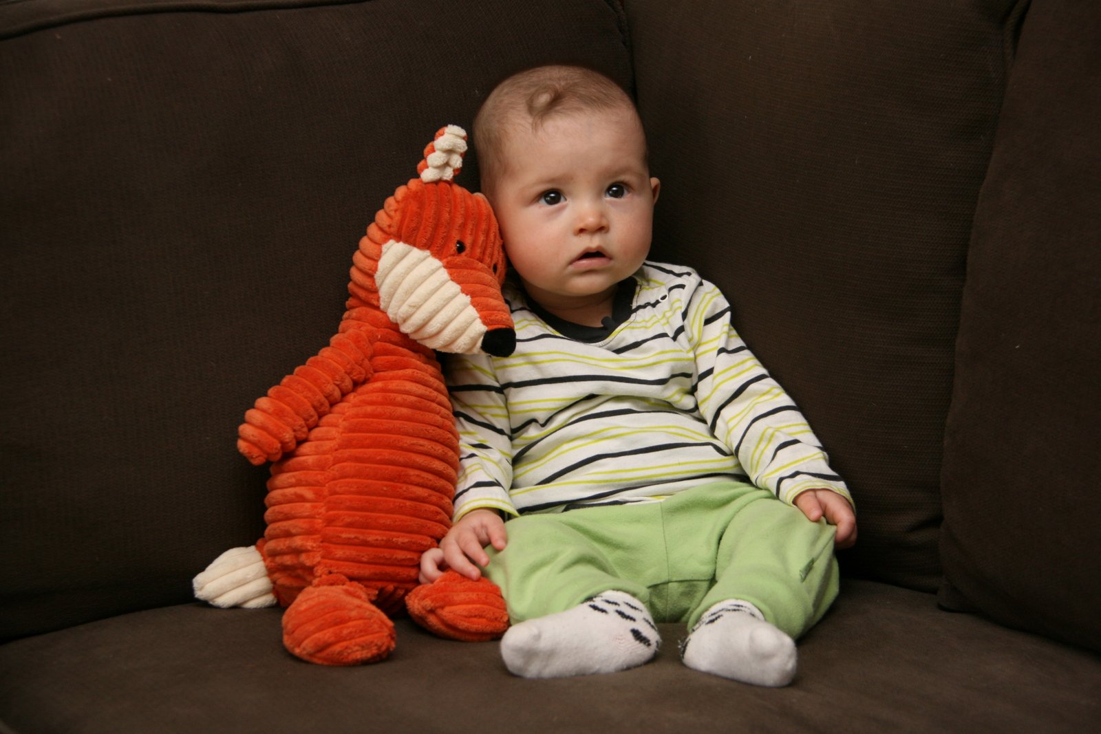 At 8 months, Dalton is 18 lbs (30%) and 28.25″ (75%) and starting to speak up a little bit.