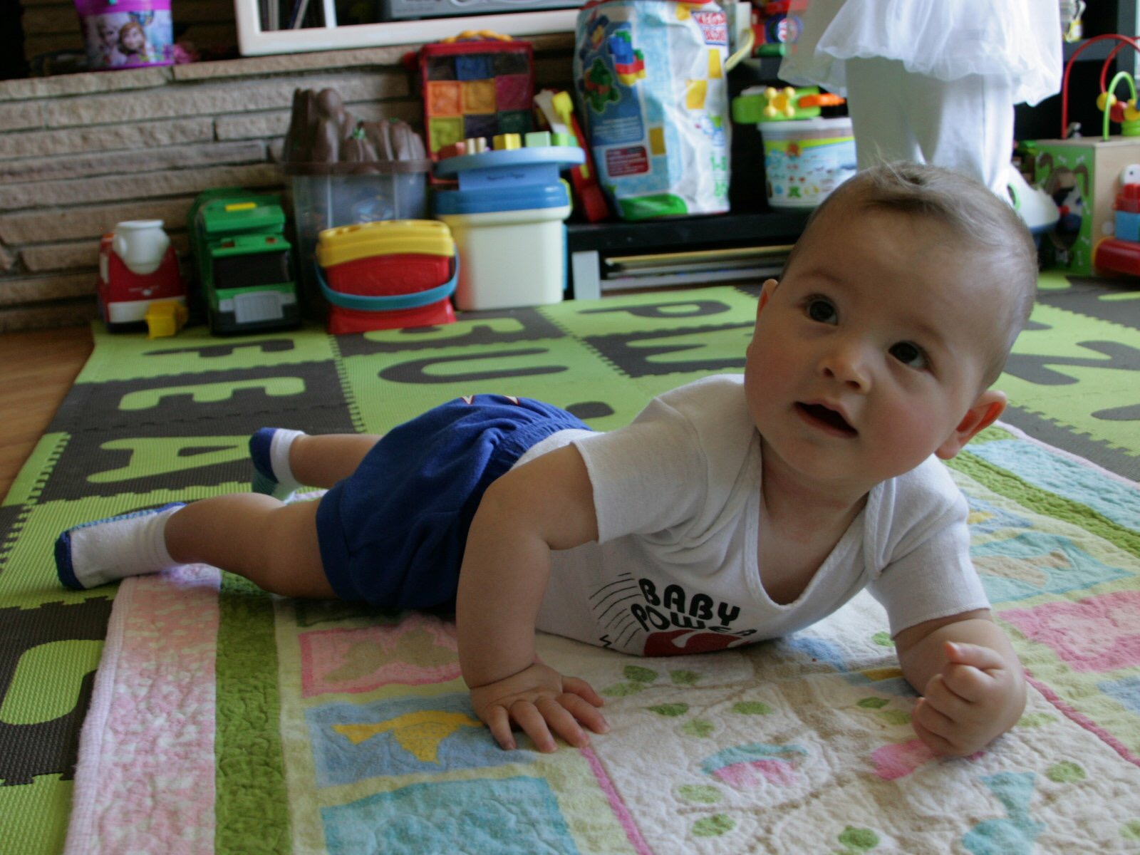 He has rolled over from back to front a few times, but not with any consistency yet, and has stayed steady in his tummy time ability and interest.